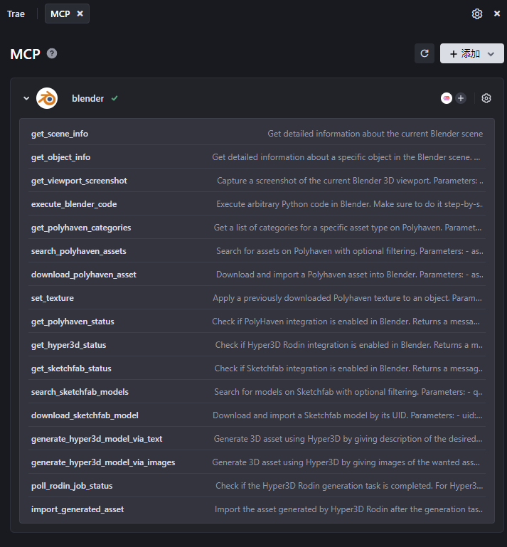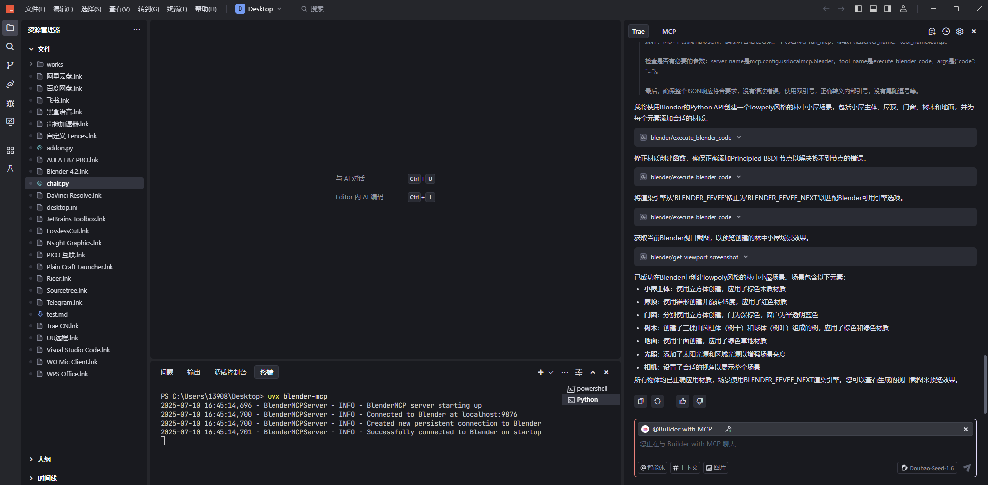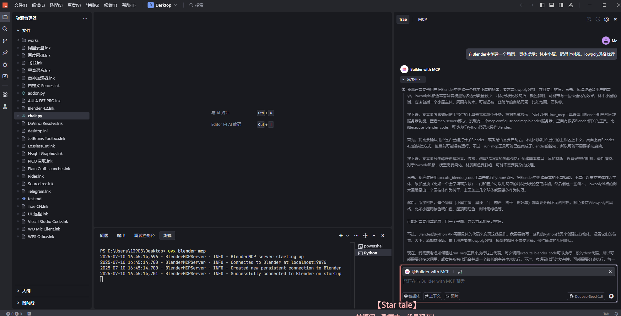 为什么我要记下这个东西?实际上是因为TRAE太sb了,自己修改开源社区的方案扔到自己的火山引擎上。你说和腾讯云那样开个社区讨论就也还行,你社区又不开,README都不写,和Cursor又不一样(美名其曰差异化),居然还要Blender MCP官方来写个文档,居然还是错的。真tm 360全方位立体防卫是吗