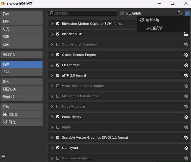 打开Blender,在左上角的菜单栏中打开:编辑-偏好设置-插件。右上角-从右上角安装,选择addon.py。