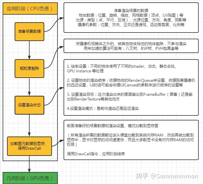 应用阶段的主要职责是输出渲染所需的几何信息(渲染图元,可以是点、线等)和渲染设置给GPU,并调用DrawCall指令开启渲染: