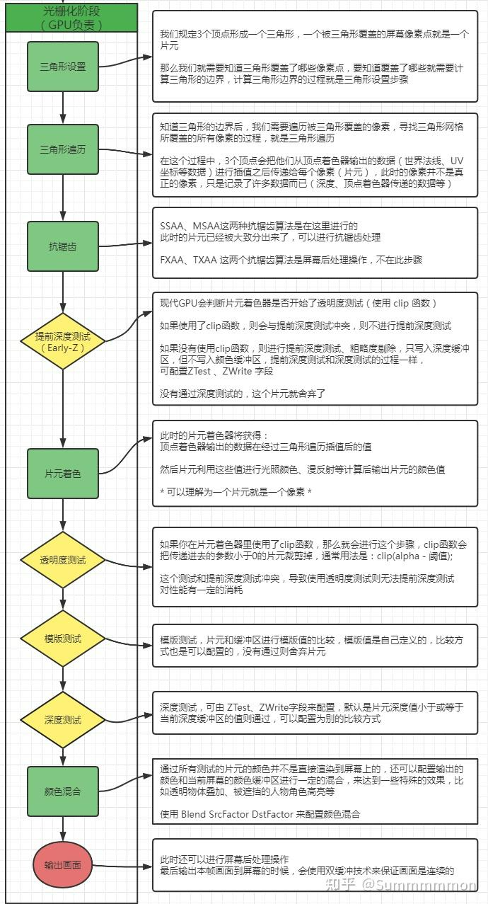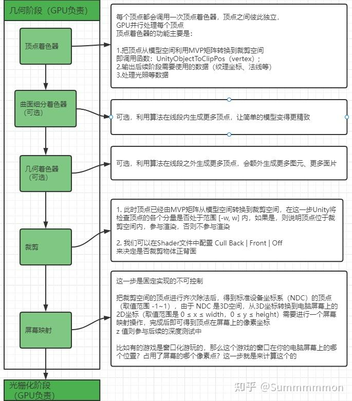几何阶段主要负责将三维的模型顶点坐标转换为屏幕空间的二维顶点坐标,输出各顶点的深度值等信息到光栅化阶段: