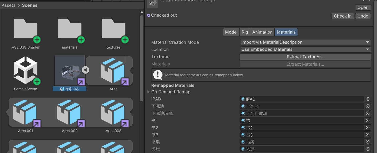 这时候Unity会自动处理并匹配对应名字的所有texture图像(因为blender已经为我们重新命名好了)。但是目前隶属于"Checkin"状态,材质不可更改。