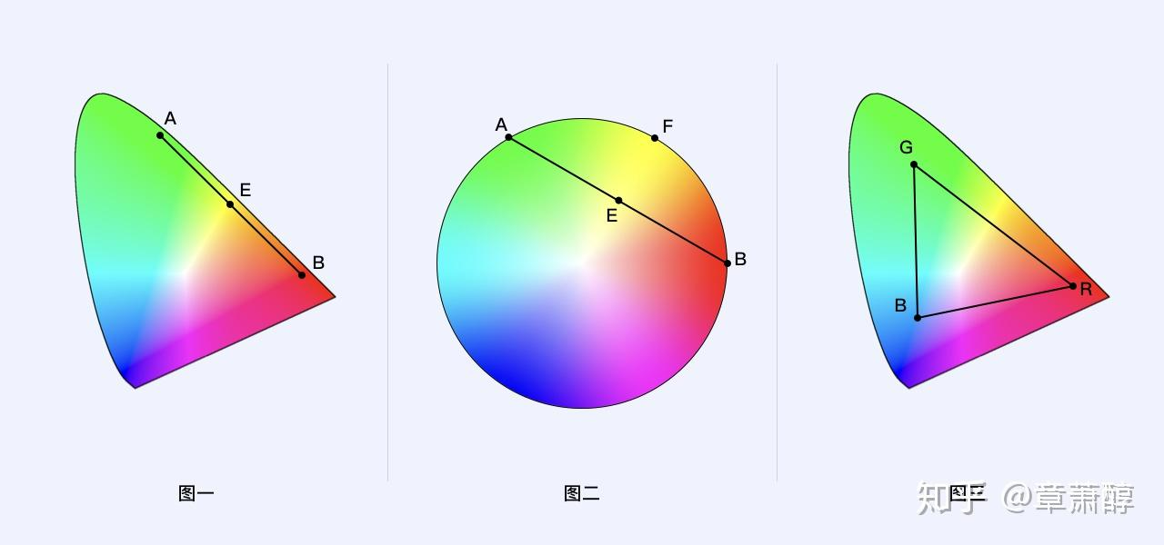 比如图一中,如果 A 点(绿色) 和 B 点(红色)两个点的颜色等比例混合,那么得到的新的颜色黄色一定在 A 点和 B 点连线的中点 E 点上,反观(图二)在圆形色盘(非感知均匀性图形)上去连接纯绿色 A 和纯红色 B 两个点,他们的中点 E 并不是纯黄色,纯黄色在圆周 F 点上;换言之,如果 A 点和 B 点两个颜色通过任意比例混合,那么得到的新的颜色也必然在 A B 两点的连线上。也就是说,(图三)R G B 三个点的颜色通过任意比例混合,他们所表现出来的新颜色也必然在这个三角范围内。