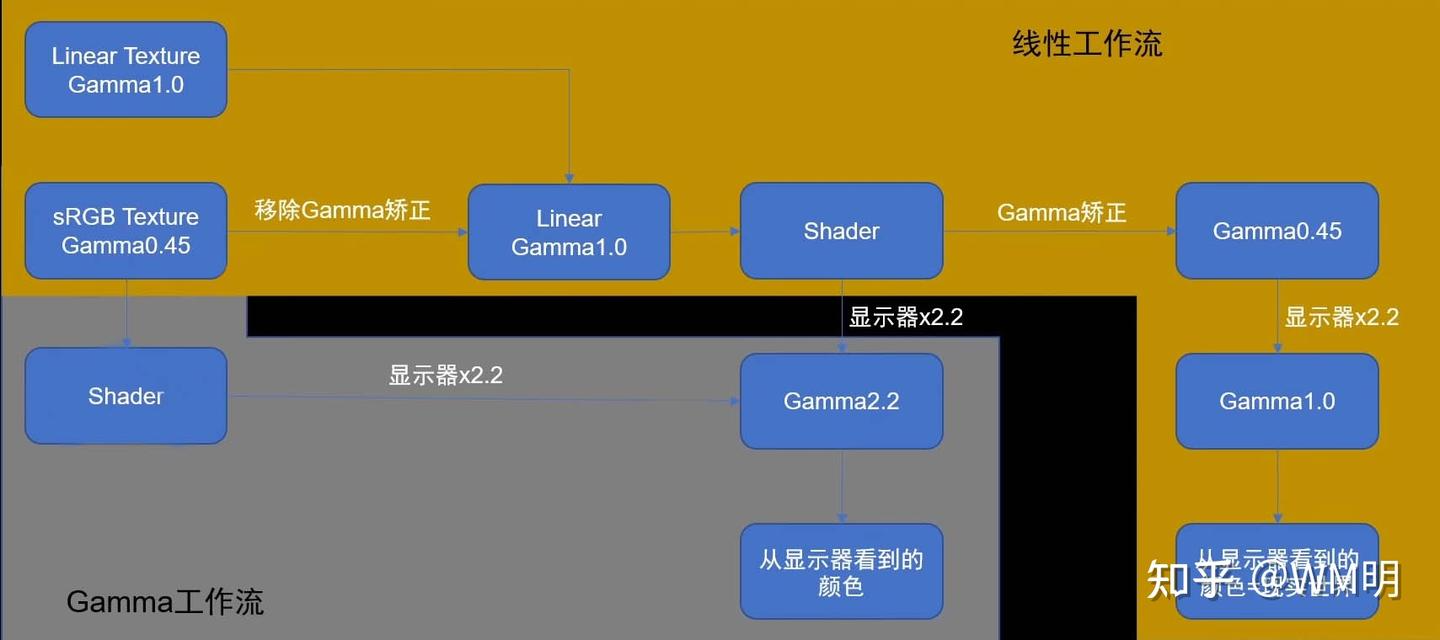 但其实gamma设计的初衷是为了适配CRT显示器,CRT显示器的特性就是亮度不随电压的变化而线性变化。因此在传输到显示器之前还要做一遍gamma,也就是gamma2.2(sRGB标准).反过来,还有gamma0.45(用于degamma恢复到线性响应)。因为现在的显示器已经可以基本做到线性的亮度显示,而现代操作系统仍然保持gamma工作流(即从主机端输出到显示器端仍然是被gamma后的色彩数据),因此显示器端要做一遍degamma。