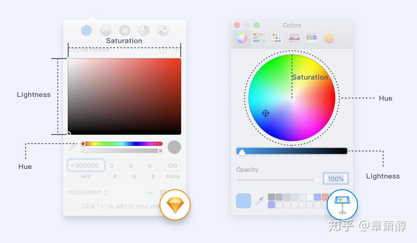 当然,这是计算机领域的表示法,艺术家们需要一个更加直观的表示方法,于是除了简单的RGB直接相加,另一种表示方法HSL应运而生,HSL模型可以更直观地反映了人类对颜色的感知方式,直接利用Hue(色相),Saturation(饱和度),Lightness(明度)表示。我们Ps中的选色盘和选色图都是基于这个标准。