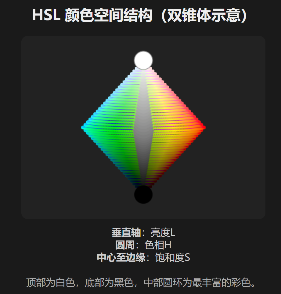- L(Lightness,亮度):从底部(黑)到顶部(白),中间是最大纯度。