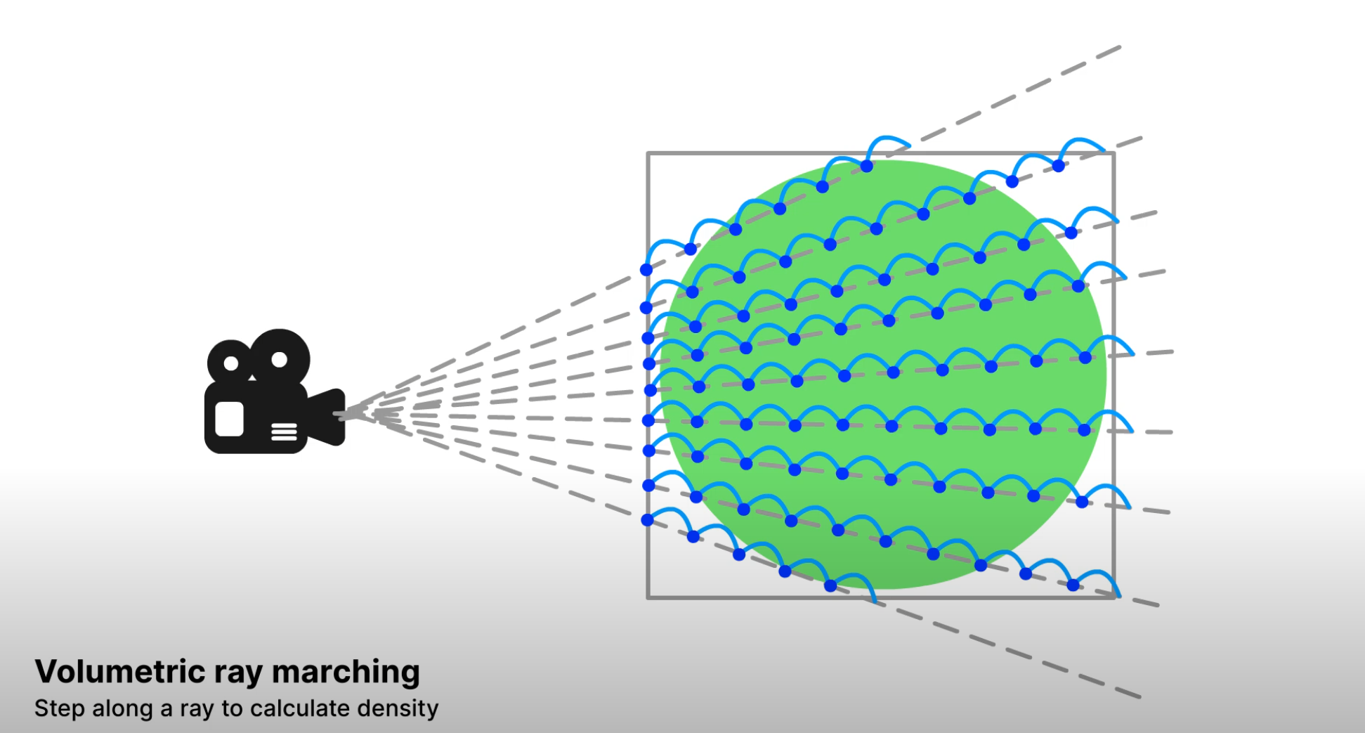 从摄像机出发,沿视线方向,对每条光线进行步进采样(类似于光线追踪)。