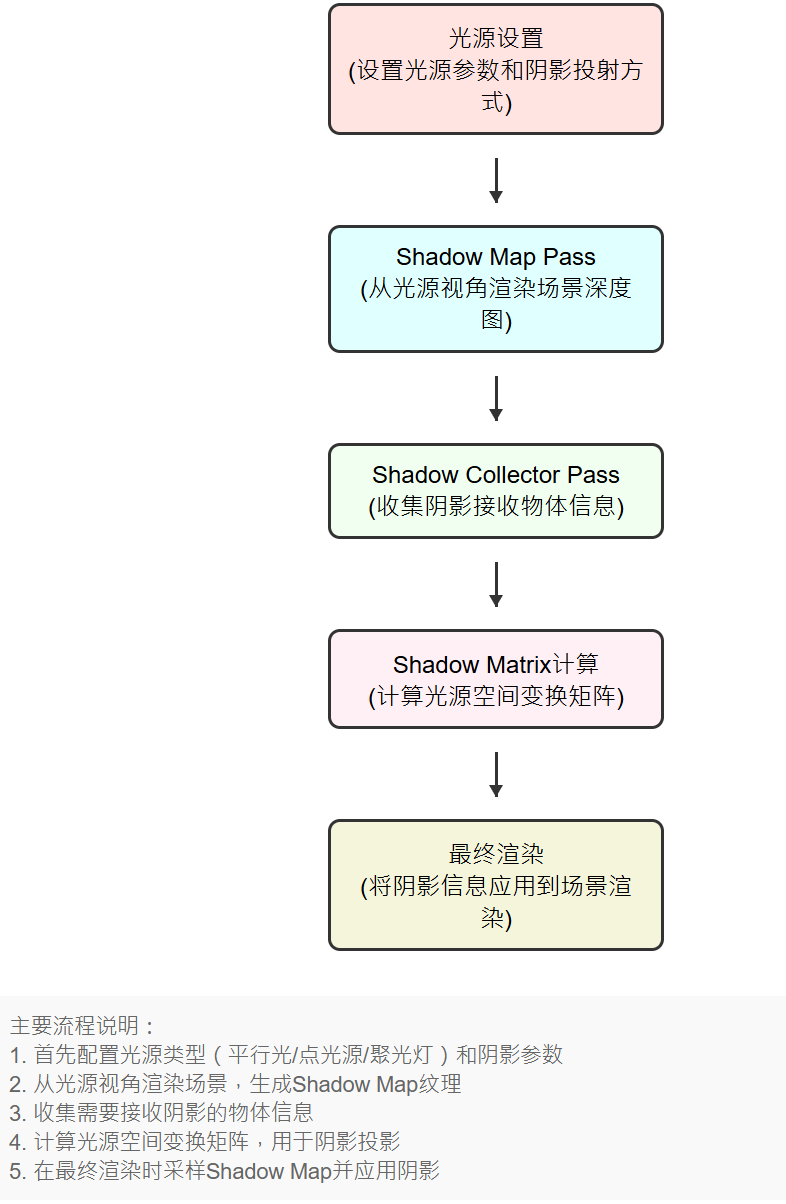 阴影的产生来自于两个核心要素:来自摄像机的深度测试、以光源为中心进行shadowmap的产生,最后和摄像机的深度图进行测试比较的过程。