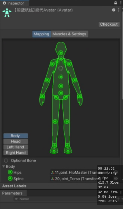 Mapping是进行关键配置的地方,如果有些地方没有出现映射的话需要我们进行手动调整,在这个情况下,模型应该摆出Tpose以方便我们进行骨骼映射。